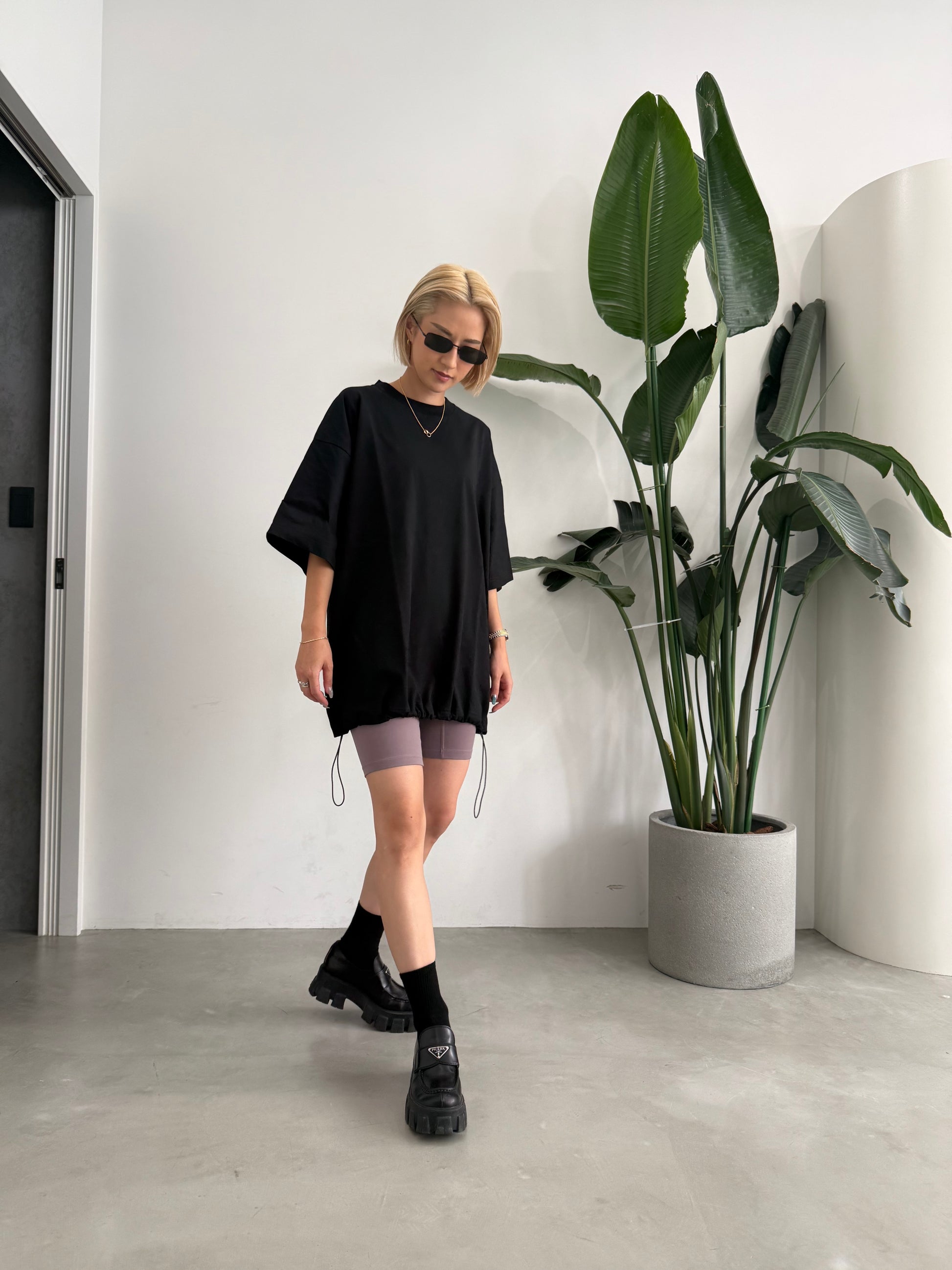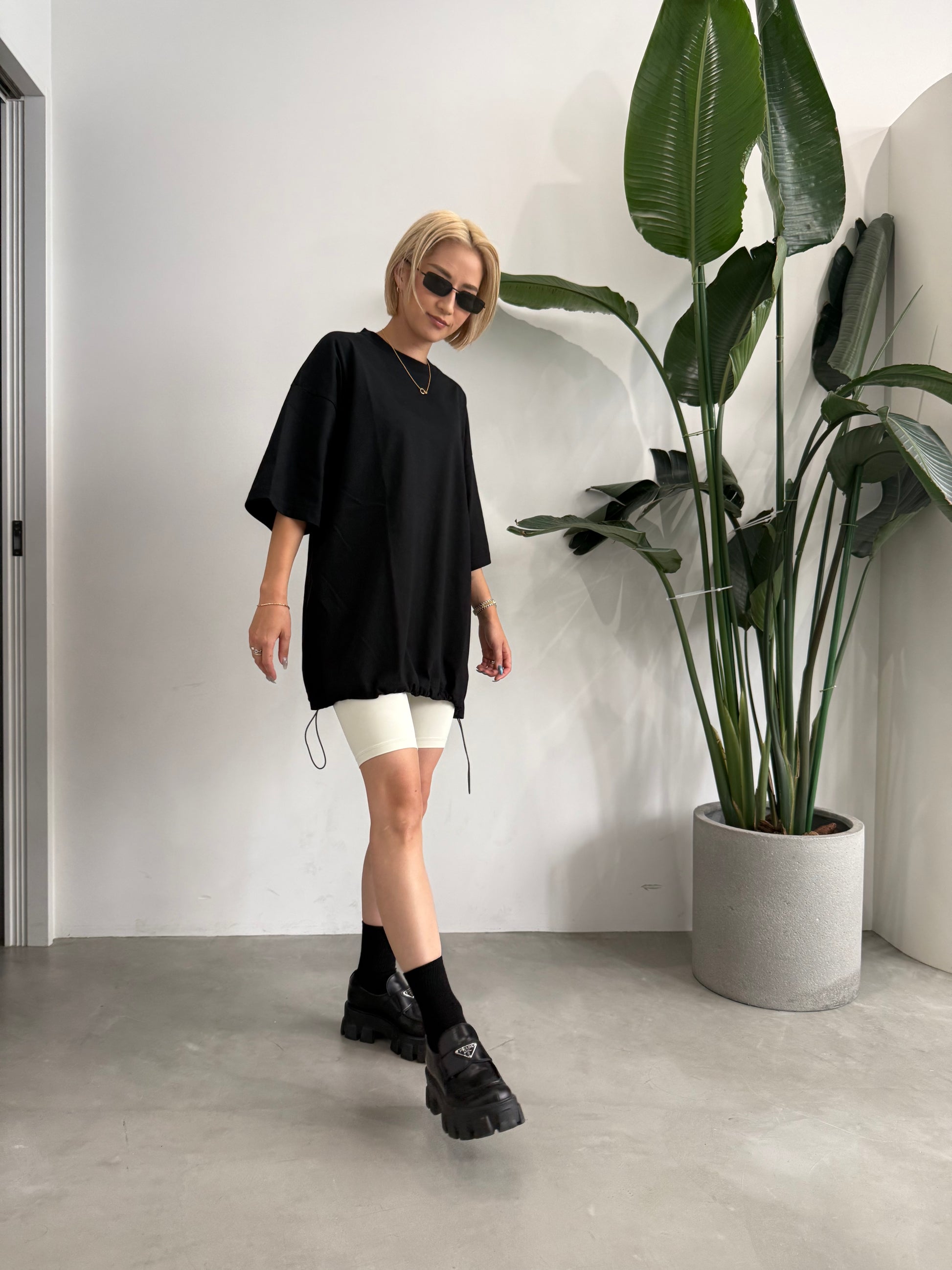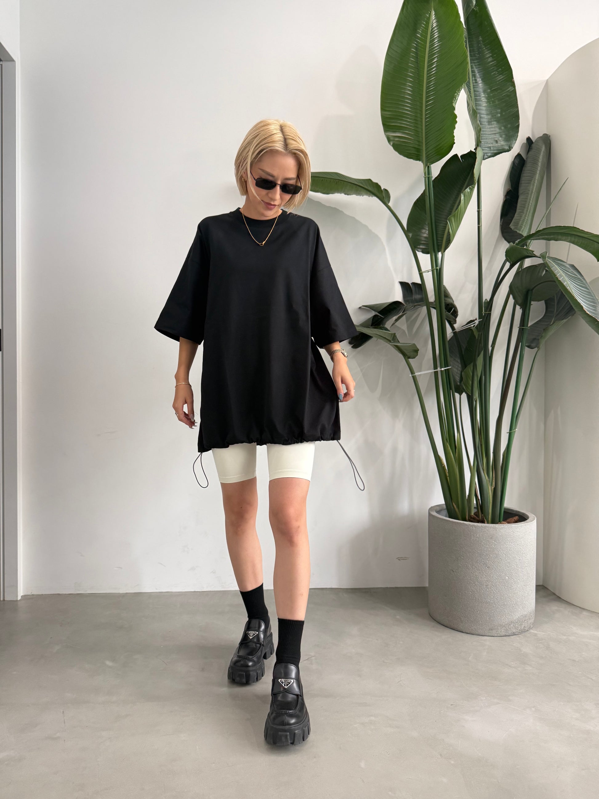 左右の裾口に、ドローコードを配したTシャツ。