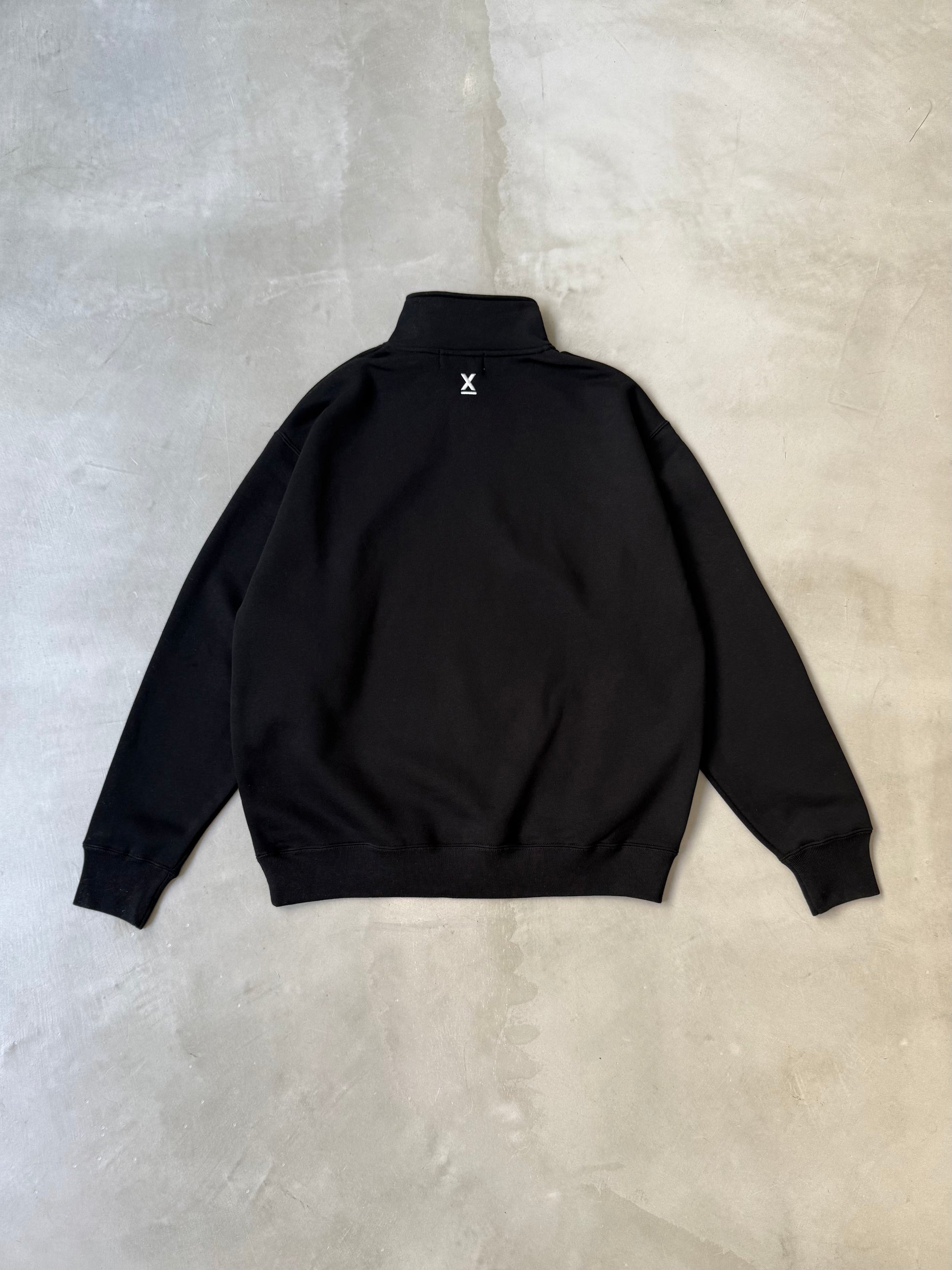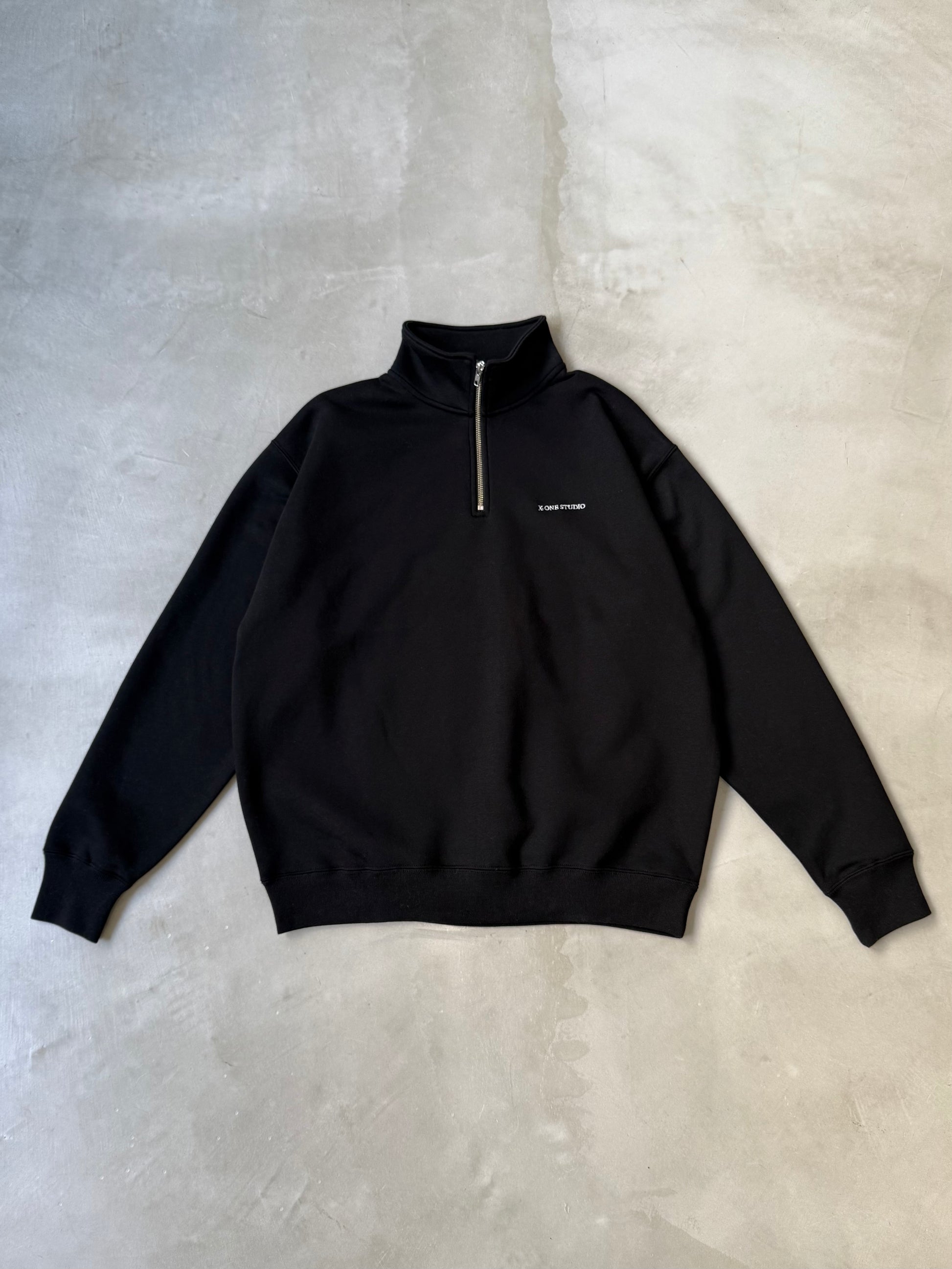 長めの袖リブ、旬顔のハーフジップがスタイリングのアクセントに。リラックス感とスポーティーな雰囲気を両立。